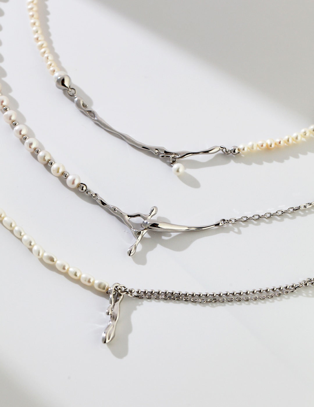 The overall necklace is made of sterling silver and pearls. The silver part combines the shape of the branches and the water flow into the natural shape that can fit the pearl and the skin. With the soft pearl, the feminine beauty is added to the delicate design.